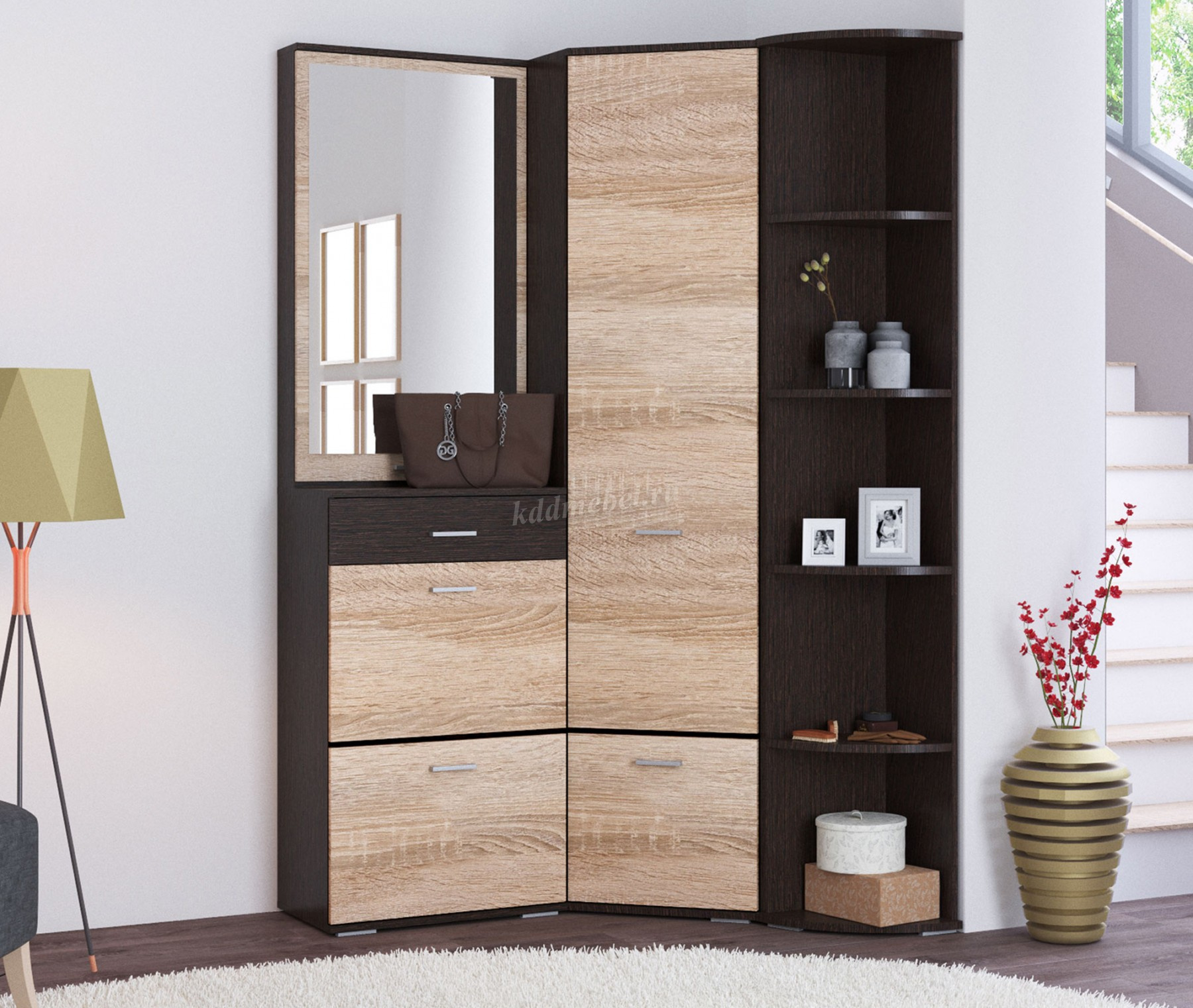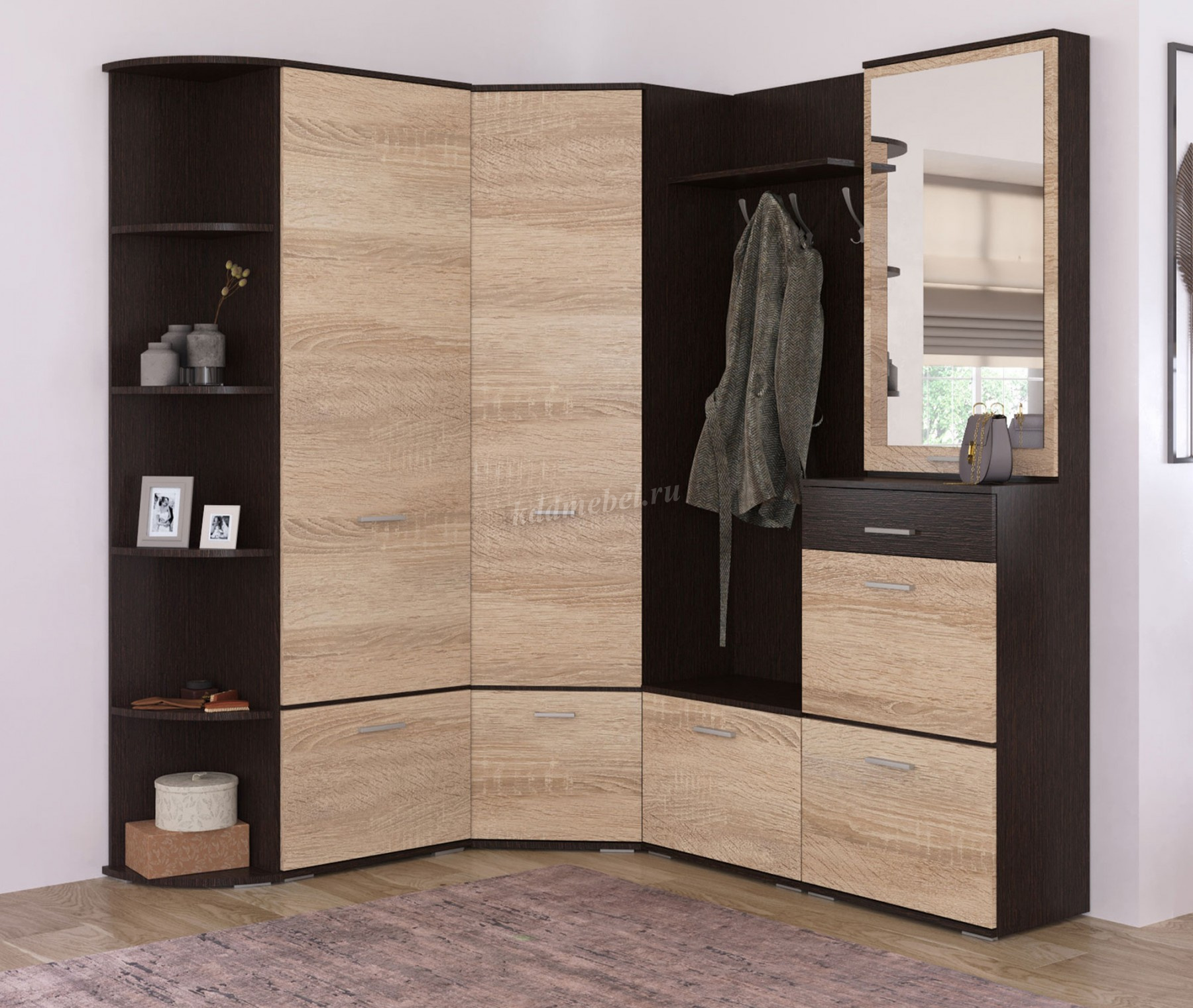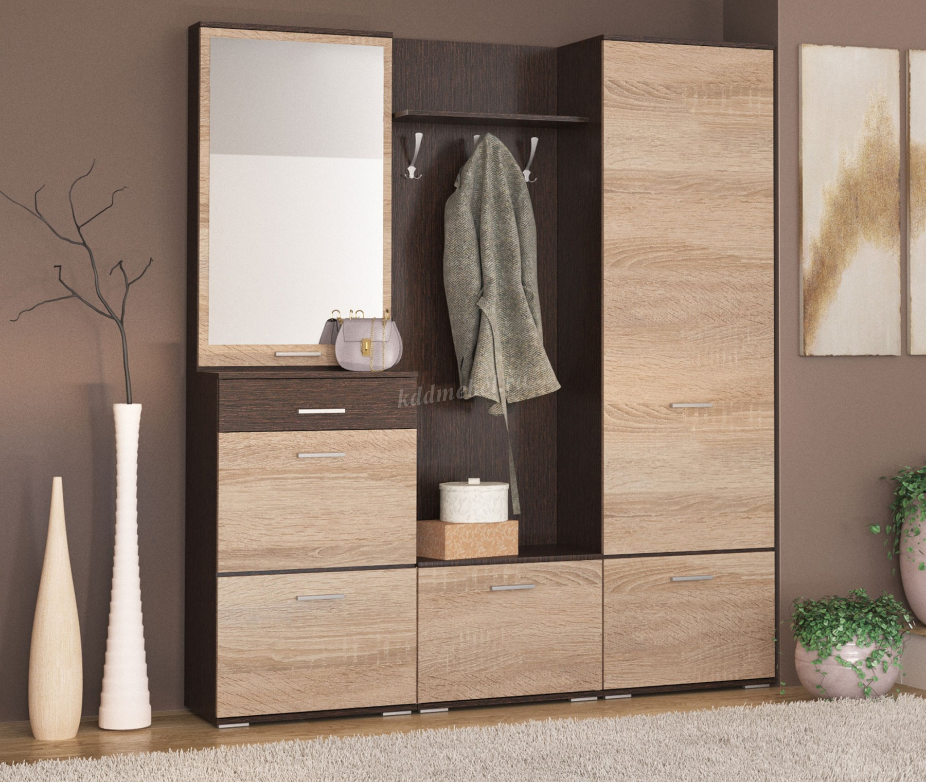 Модуль укомплектован полкой для головных уборов и крючками для одежды. В нижнем отделе секции находятся шкафчик для хранения различных принадлежностей для обуви. Корпус цвета венге подчеркивают древесную текстуру и рисунок светлого дуба сонома, придает эффектный вид. Идеально компонуется со всеми модулями системы Виола.